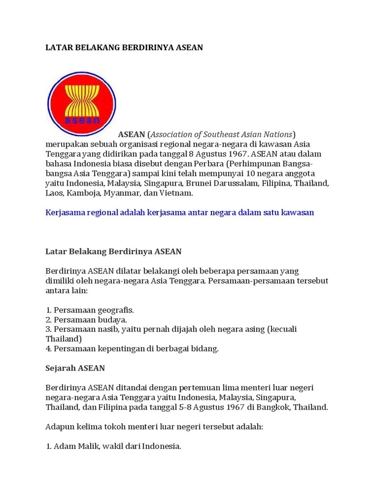 Terbentuknya asean atau association of south east asian nations dimulai adanya tekad dari para pendiri asean untuk menciptakan kawasan asia . Asean yang merupakan singkatan dari association of southeast asian. Asean lahir atau dibentuk pada 8 agustus 1967 di bangkok, thailand. Berikut ini sejarah terbentuknya asean yang dirangkum portal jogja. Asean atau association of southeast asian nations merupakan organisasi yang menjadi bentuk kerja sama 10 negara di asia tenggara.